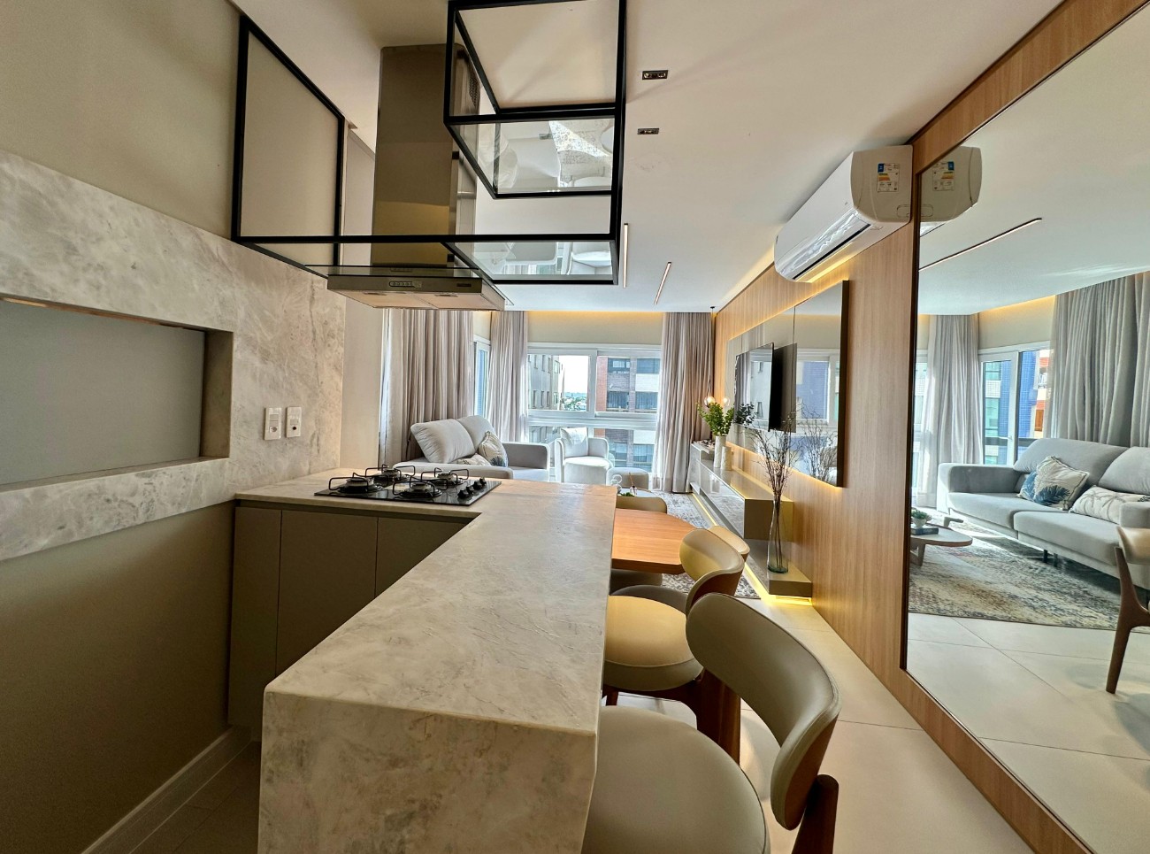 Lindo apartamento! Novo, nunca habitado! Imóvel composto por 02 dormitórios, sendo 01 suíte, finamente mobiliado & decorado, sacada integrada de frente com terraço, cozinha estilo americana com churrasqueira, 108m² de área privativa e box de garagem de fácil acesso com tomada para carro elétrico + depósito. Edifício novo, recém construído, localizado ao lado da praça Flávio Boianovisk e a poucas quadras do mar. O prédio também conta com hall de entrada decorado, 02 elevadores, infraestrutura na cobertura (Rooftop) com salão de festas, espaço kids, piscina, academia, zeladoria permanente e portaria eletrônica. Gostou do imóvel? Entre em contato conosco e agende a sua visita!