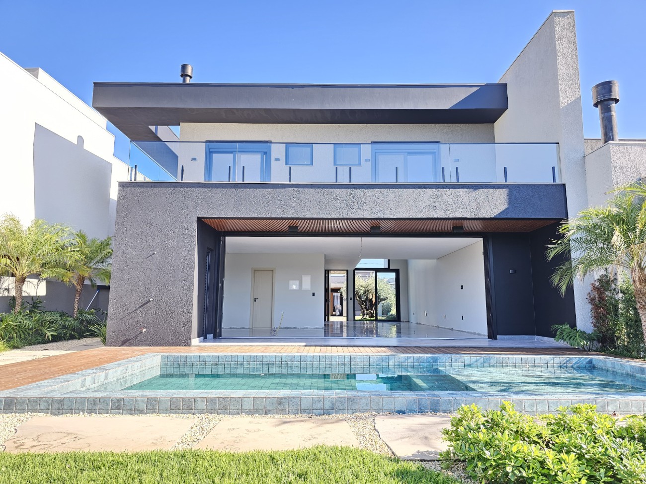 Condomínio Capão Ilhas Resort - Sobrado beira lago com 280 m², composto de quatro suítes individuais, sendo uma térrea e duas com sacada para o lago, linda e moderna fachada com detalhes em madeira, e em iluminação de leds, abrigo para dois veículos, entrando no imóvel, uma ampla sala de estar e jantar, puro luxo e sofisticação, cozinha no estilo americano, abertura total de toda esquadria dos fundos para piscina, integrando os ambiente, piscina de concreto com espera para aquecimento, deck de madeira de nobre e deck molhado, mais iluminação interna da piscina, lavabo externo, fundo para o lago, ainda na parte externa temos o paisagismo todo pronto, com plantas adultas, e uma Oliveira Centenária, irrigação completa e automatizada e todo jardim e parte externa da casa com uma iluminação planejada, voltando ao interior, temos espera para automação de toda casa, aberturas em PVC com persianas automatizadas, revestimentos cerâmicos, porcelanatos e mármores classe A, nos dormitórios temos o piso vinílico, lavabo, uma escadaria revestida com madeira de alta qualidade e com iluminação de leds, temos muito mais luxo e funcionalidade do imóvel, que podem ser confirmado pessoalmente, então não perca tempo, agende sua visita com um de nossos corretores