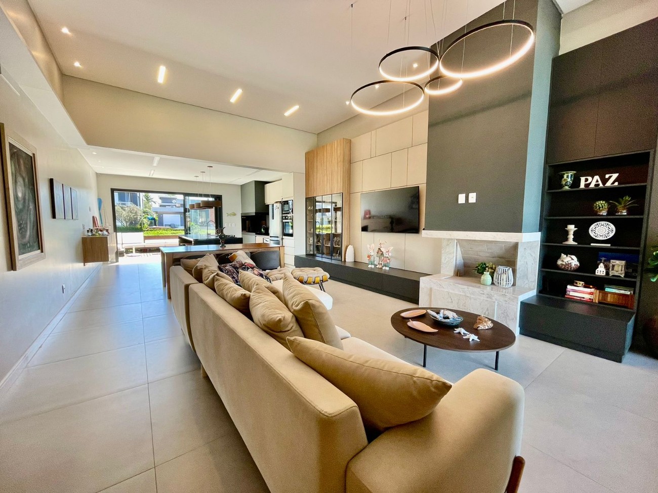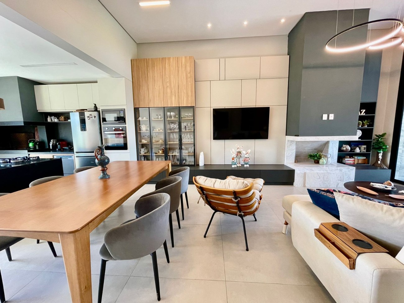 Casa moderna, finamente mobiliada e decorado, sendo 188 M2, composta de 4 suítes, lavabo, cozinha americana, sala de estar e jantar, espaço gourmet integrado a área externa, beira lago, ótima localização no condomínio, junto ao clube, casa baixa de alto padrão, aberturas em Pvc, automação, garagem para dois carros, confira condições de pagamento e agende sua visita.